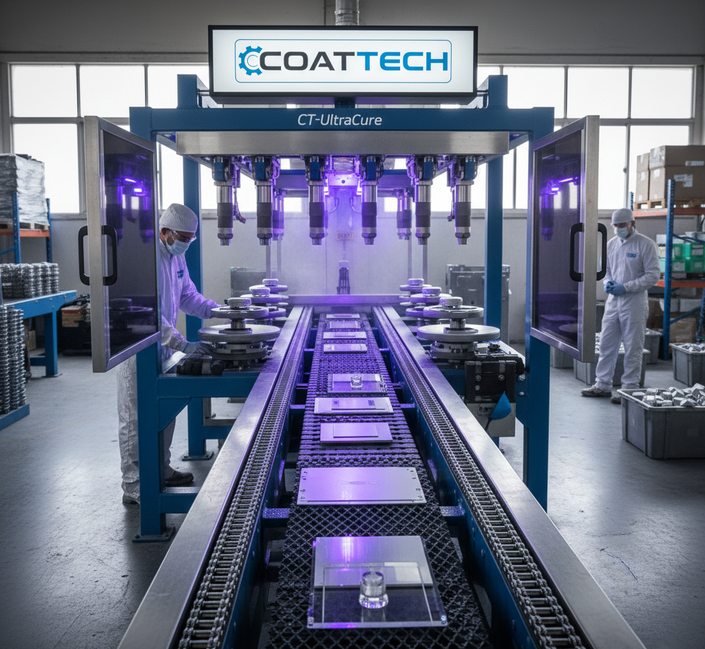CT-UltraCure को यूवी-संवेदनशील सामग्रियों से लेपित सपाट या कम-प्रोफाइल वाले भागों के तत्काल इलाज के लिए डिज़ाइन किया गया है। भाग उच्च-तीव्रता वाली पारा या एलईडी यूवी लैंप के नीचे एक प्रकाश-परिरक्षित सुरंग से गुजरते हैं, जो तुरंत ठीक हो जाते हैं। इससे भागों को लाइन के अंत में तुरंत ढेर या पैक किया जा सकता है।