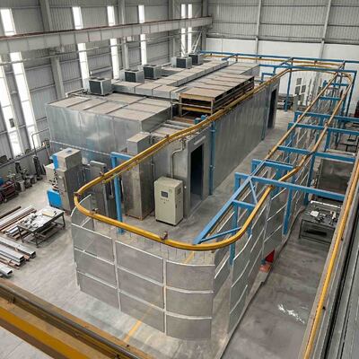 औद्योगिक ओवरहेड सामग्री हैंडलिंग प्रणाली जो धातु के भागों को एक स्वच्छ पाउडर कोटिंग और विनिर्माण सुविधा के माध्यम से मार्ग प्रदान करती है।